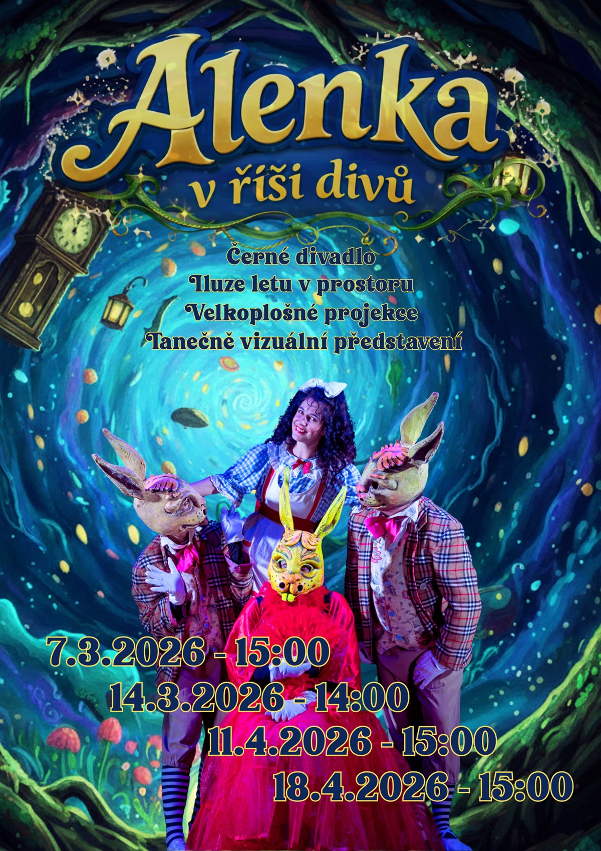 Zveme vás na rodinné představení černého divadla, které kombinuje moderní technologie, fascinující hru světel a stínů a herecké výkony, které vás vtáhnou přímo do děje. Zapomeňte na všední starosti a propadněte se s námi králičí norou do světa, kde se fyzikální zákony mění v pouhou iluzi.