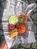 Smažená bolivijská bramborové krokety plněné goudou a čedarem, s papričkami guajillo, česneková aioli, pošírovaná červená cibule v pomerančové šťávě, salsa roja s papričkami chipotle, středoamerický lehce fermentovaný salát curtido
