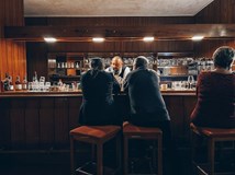 Lobby bar volně navazuje na hlavní sál a posezení je v pohodlných dobových křeslech s nízkými stolky.